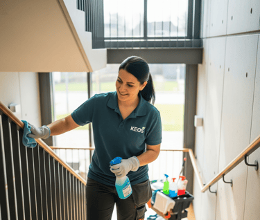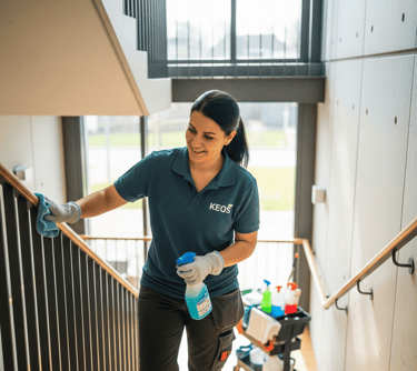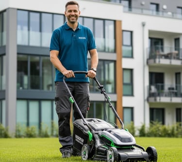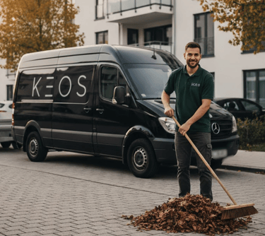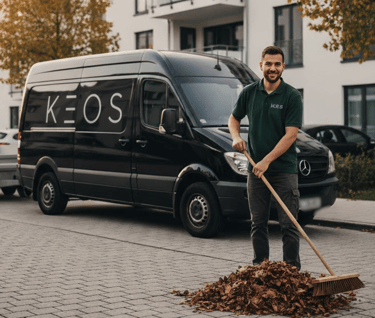KEOS bietet professionelle Reinigung und Pflege für Außenflächen, Wege, Grünanlagen, Treppenhäuser und Parkplätze.